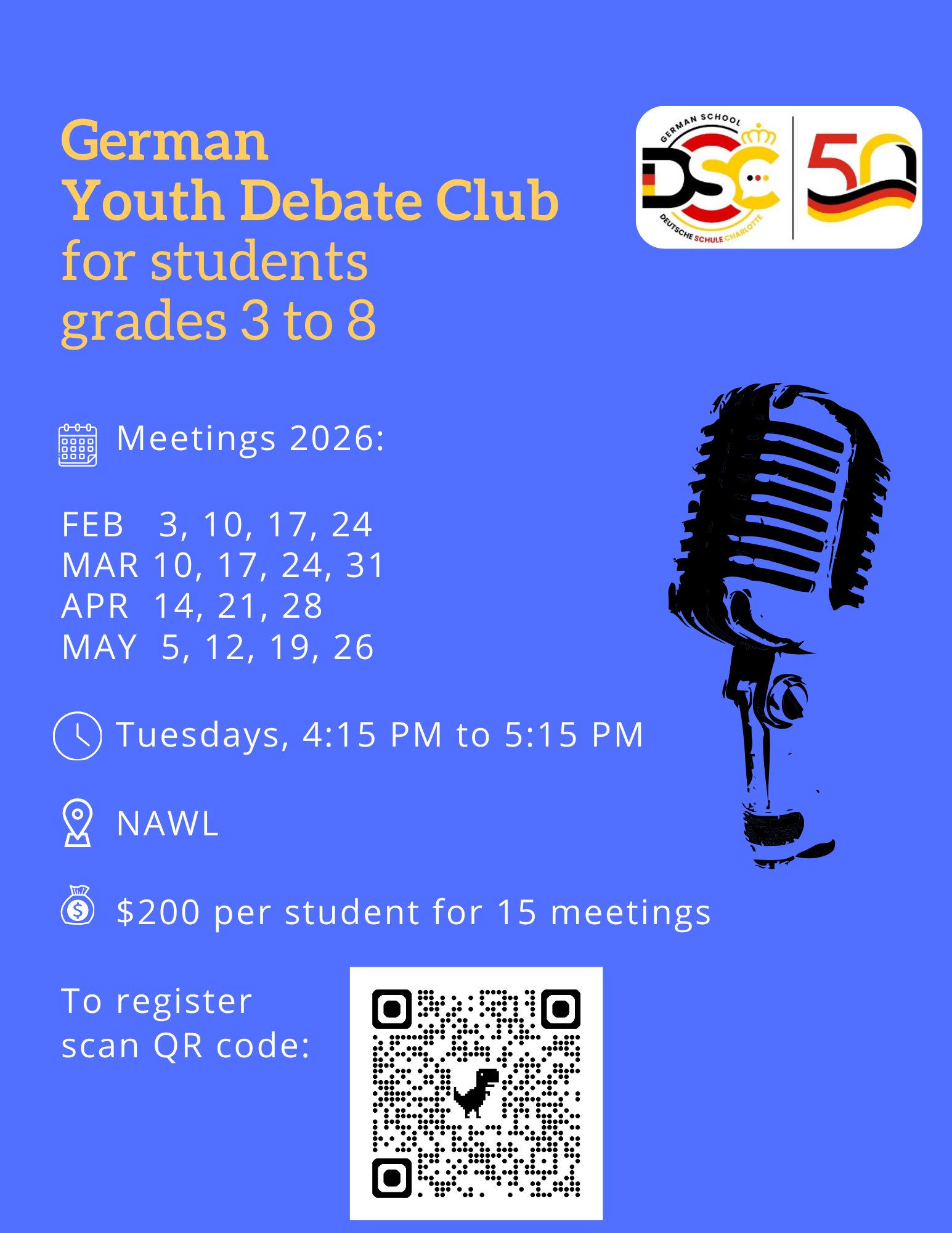 The German School of Charlotte (DSC) is excited to announce the launch of its German Youth Debate Club at the North Academy of World Languages (NAWL)—marking an important milestone in our mission to bring high-quality German language and cultural programs to more students throughout the Charlotte region.
